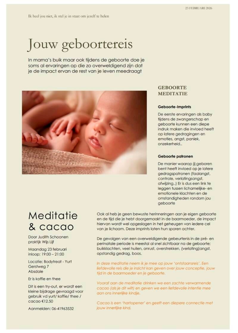 Maandag 23 februari 2026 is er weer een geboortereis Meditatie. Wil je er graag bij zijn meld je dan aan door een berichtje te sturen
